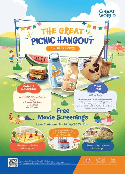 Tayangan filem kanak-kanak secara percuma, permainan Uncle Ringo, makanan ringan yang menarik dan bengkel interaktif – semuanya diadakan dalam suasana piknik moden dalam pusat beli-belah. Sesuai untuk kunjungan seisi keluarga yang ingin melakuan pelbagai aktiviti tanpa perlu risau tentang cuaca.