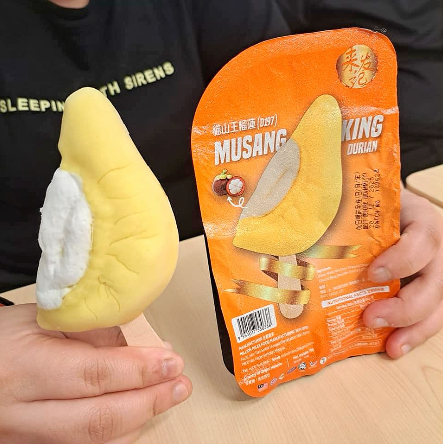 Ada 'Musang King Stick' (S$7.30) dan 'Black Thorn Stick' (S$7.80), yang menurut Lawrence diperbuat daripada buah durian Mao Shan Wang dan 'black thorn' asli.