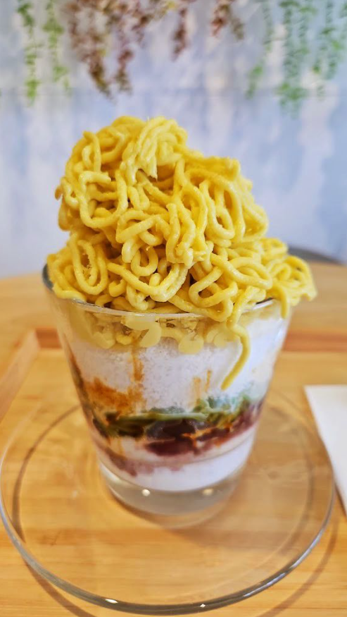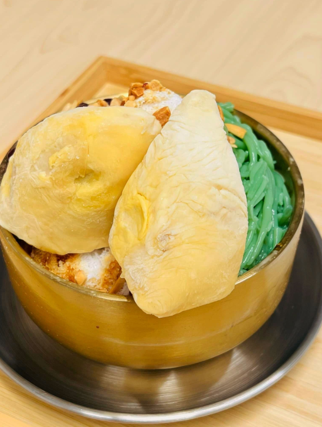 Pencuci mulut itu dihidangkan dengan puri durian dalam bentuk mi, di atas chendol.