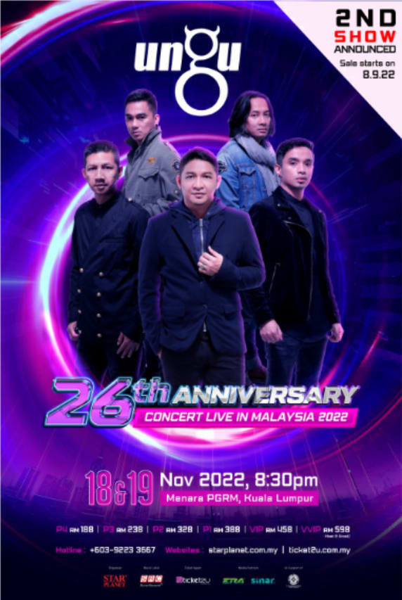 Konsert anjuran Star Planet, “Ungu’s 26th Anniversary Live in Malaysia” akan diadakan pada 18 dan 19 November 2022, pukul 8.30 malam di STAR Convention & Exhibition Centre, Menara PGRM di Kuala Lumpur.