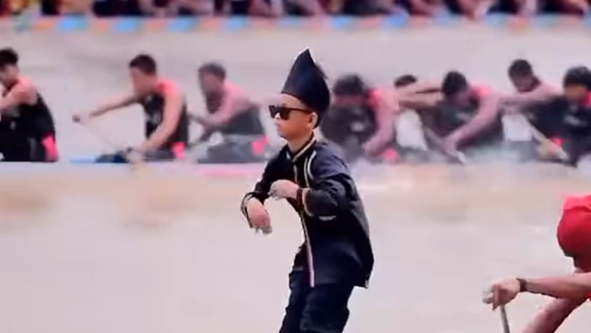Rayyan Arkan Dhika, menari di haluan perahu dalam tradisi tahunan Pacu Jalur di Sungai Kuantan, Riau. (Gambar: YouTube)