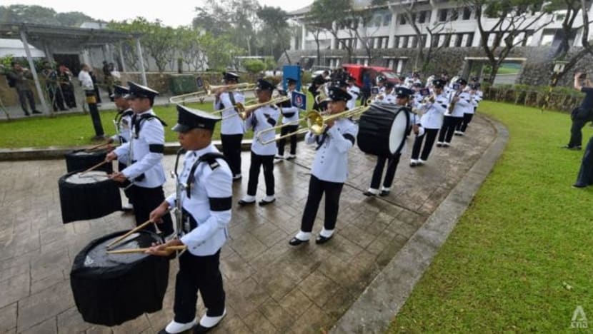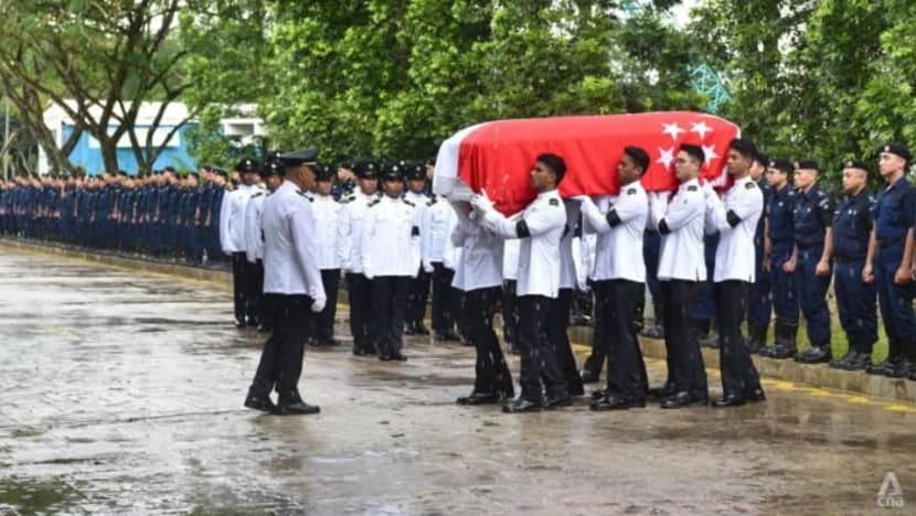 Para anggota Pancaragam Pasukan Polis Singapura mengiringi keranda mendiang ke dewan krematorium itu, dengan lebih seratus pegawai SCDF membarisi sepanjang jalan raya tersebut.