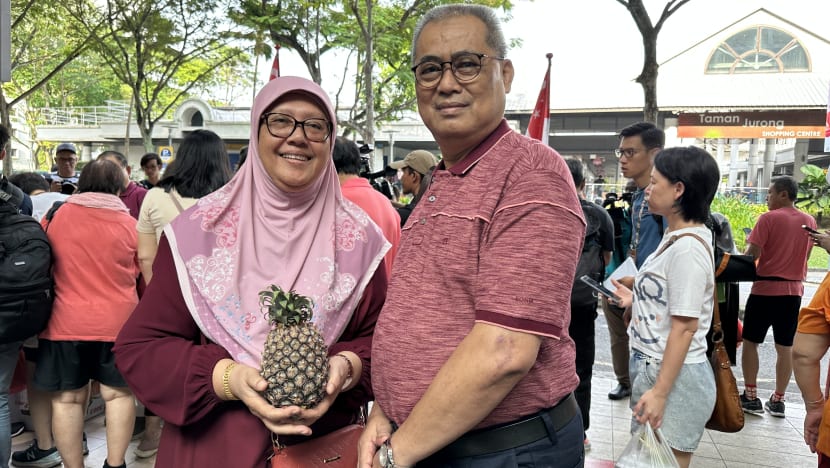 Mereka juga tersenyum ceria apabila menerima buah nanas - lambang yang digunakan Encik Tharman semasa berkempen.