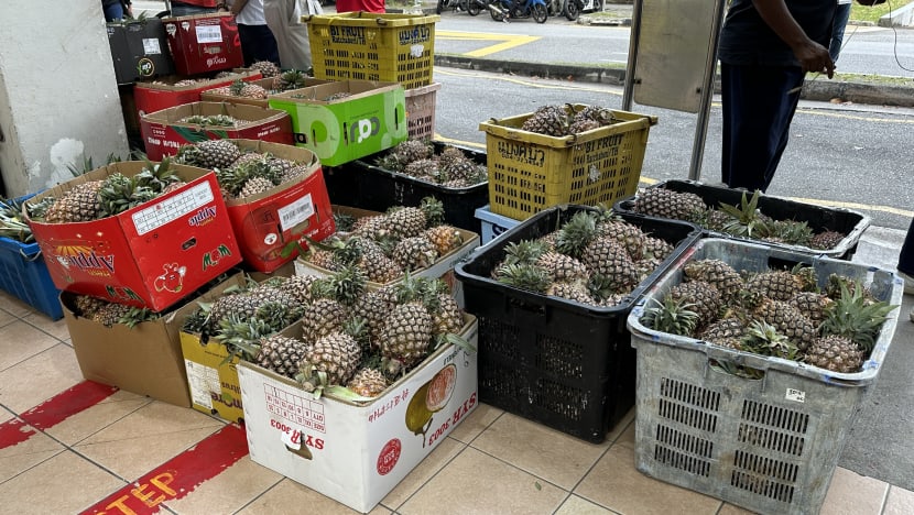 Berkotak-kotak buah nanas dikeluarkan dari lori dan BERITA Mediacorp difahamkan buah-buah itu ditaja oleh pemilik kedai di pasar itu dan sebuah kuil.