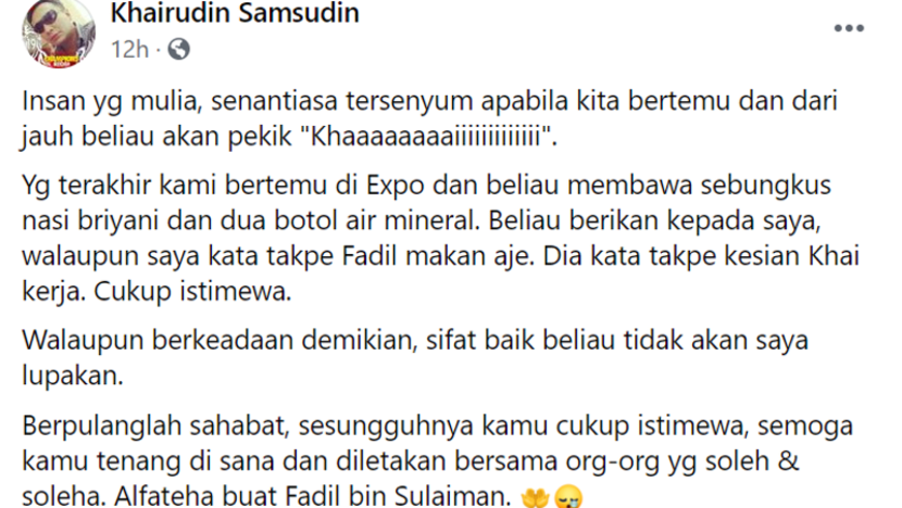 Seorang lagi rakan selebriti yang terkesan dengan pemergian Fadil ialah pengacara popular Khairudin Samsudin.
