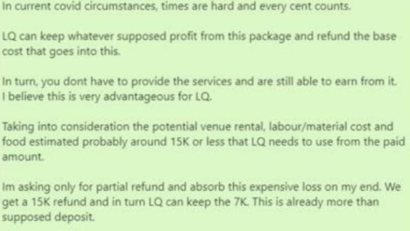 "Selepas majlis perkahwinan pada 8 Ogos, kami tidak segera menuntut bayaran balik kerana kami percaya beliau (pemilik WLQ) akan memenuhi janjinya dan beri kemas kini kepada kami. (Namun) tiada bayaran balik yang kami terima," cerita Encik Fariq kepada BERITAmediacorp.