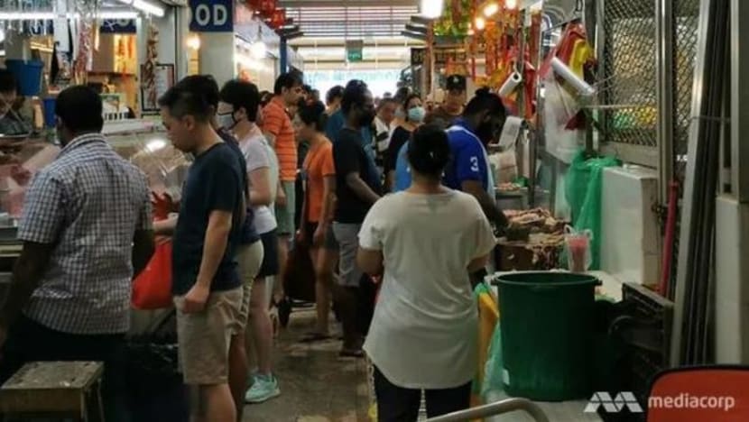 Meskipun Perdana Menteri Lee Hsien Loong berkata dalam ucapannya kepada negara pada Jumaat bahawa pasar basah dan pasar raya akan terus dibuka, masih terdapat orang ramai yang berpusu-pusu ke sana untuk membeli bekalan barangan.