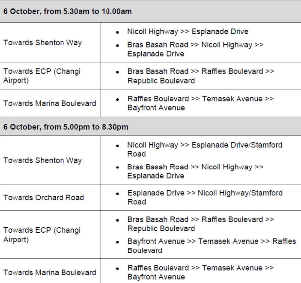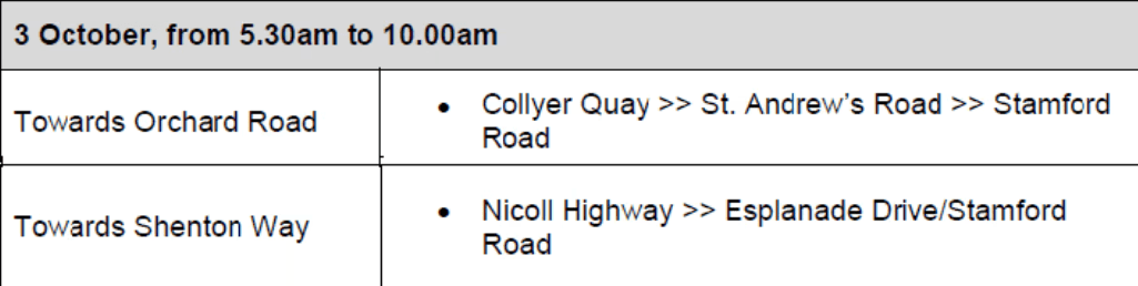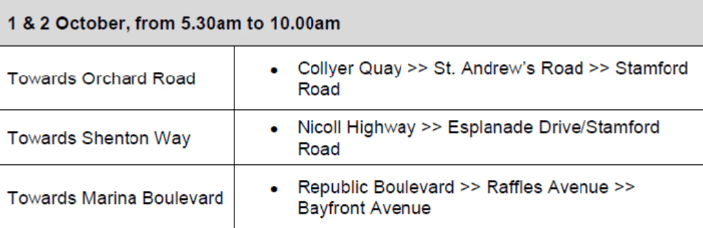 Beberapa jalan raya di kawasan Marina Centre dan Padang akan ditutup sepanjang tempoh tujuh hari pada Oktober sempena Grand Prix Singapura.