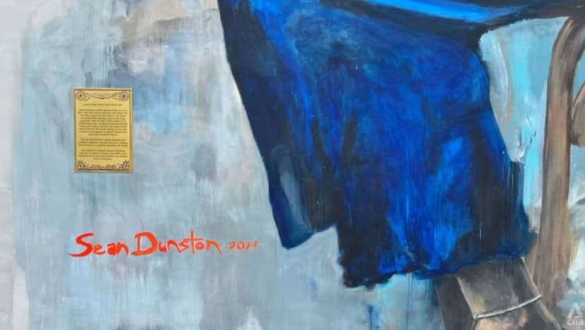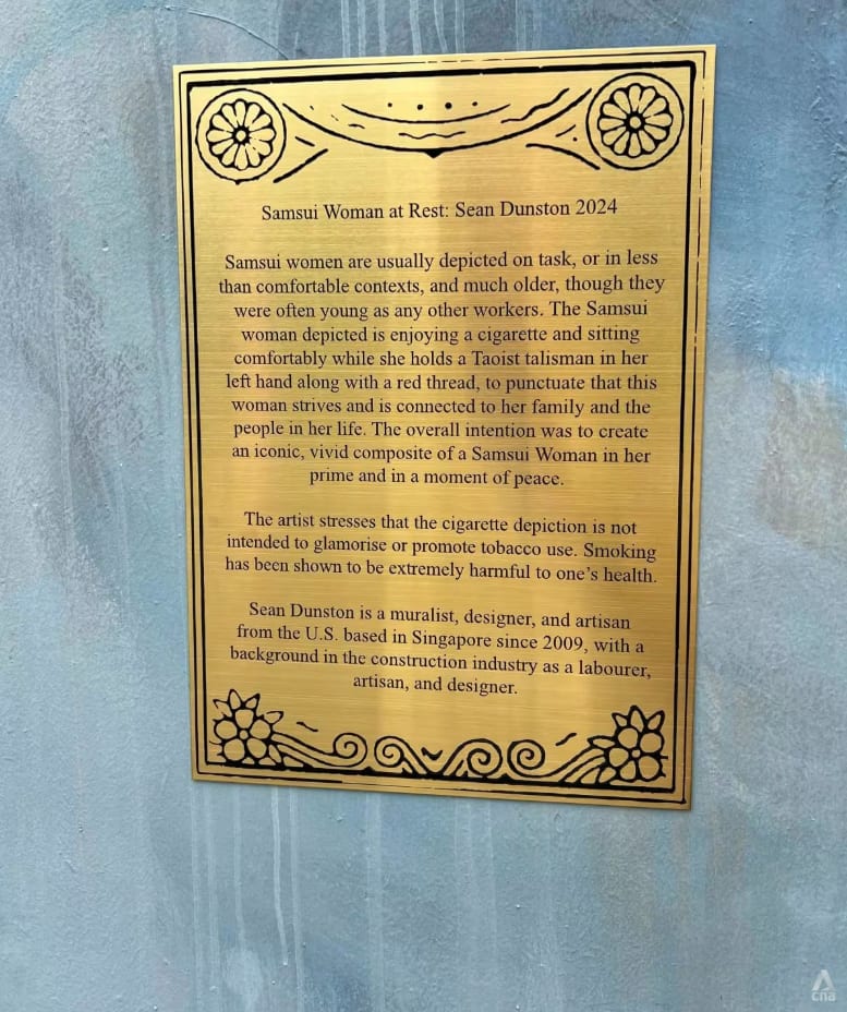 Plak dipasang pada mural wanita samsui merokok di Chinatown. (Gambar: CNA)