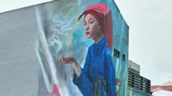 Plak dengan mesej antimerokok dipasang pada mural wanita samsui di Chinatown