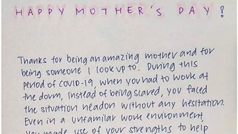 SINGAPURA: Cik Azrina Azim yang dikerahkan untuk bertugas di dormitori Avery Lodge bersama Pasukan Sokongan dan Jaminan ke Hadapan (FAST) pada 10 Mei lalu menerima kad Hari Ibu yang menyayat hati daripada anak perempuan sulungnya Jasmine.